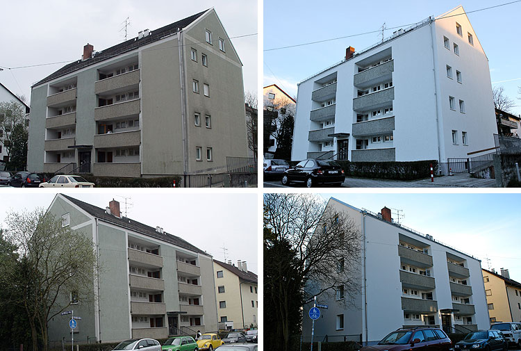 Energetische Sanierung Mehrfamilienhaus in der Gräfstraße, München. Planung: Wechner Architekten, München Energieberatung mit KfW-Förderung, energieeffiziente Einzelmaßnahmen Ostgiebel Bestand Ostgiebel saniert Westgiebel saniert Westgiebel Bestand